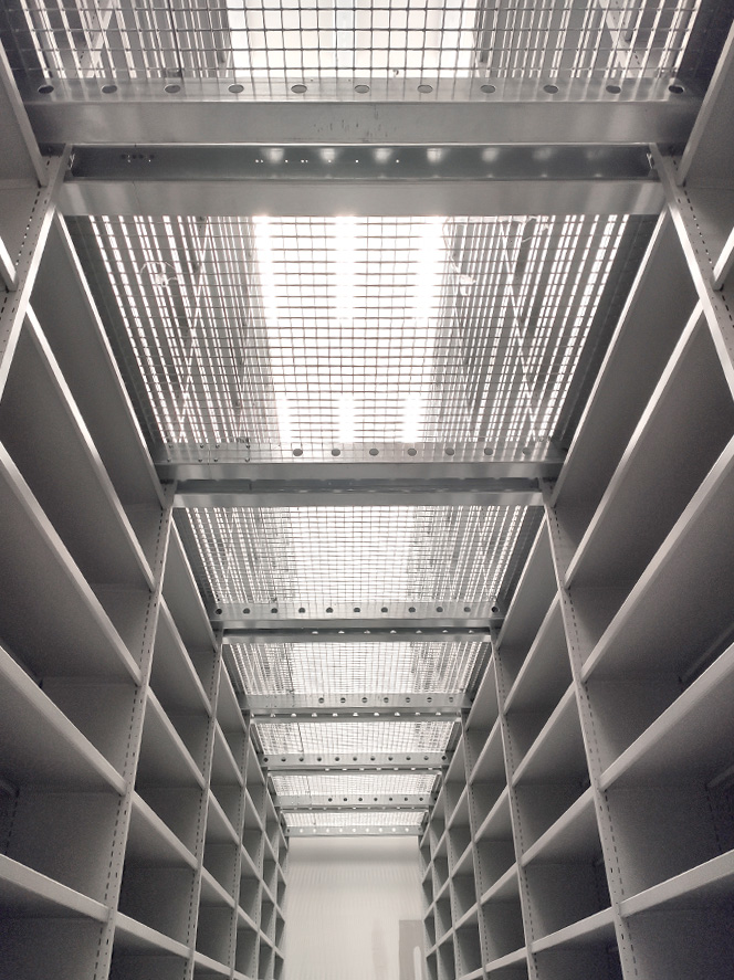 It was necessary to manufacture more than 32,000 shelves for the racks, made up of 107 double mobile trolleys ranging between 8.40 and 10.40 meters. 25 containers of 60 cubic meters capacity, altogether, more than 152 tons were needed for all the material that was transported by ship.