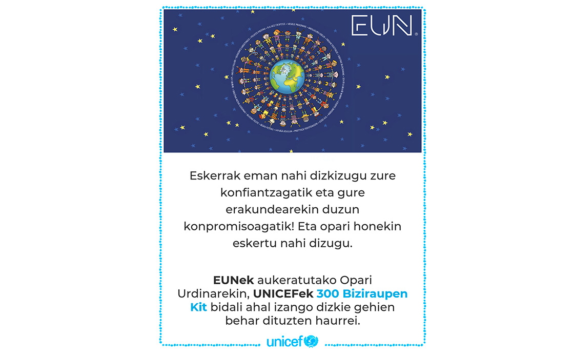 Oparirik onena partekatzea dela sinetsita, aurten EUNen behar gehien dutenen ondoan egon nahi izan dugu. UNICEFekin batera, zaurgarritasun-egoeran dauden haurrei oinarrizko beharrak estaltzen laguntzeko 300 biziraupenerako kit bidali dizkiegu.